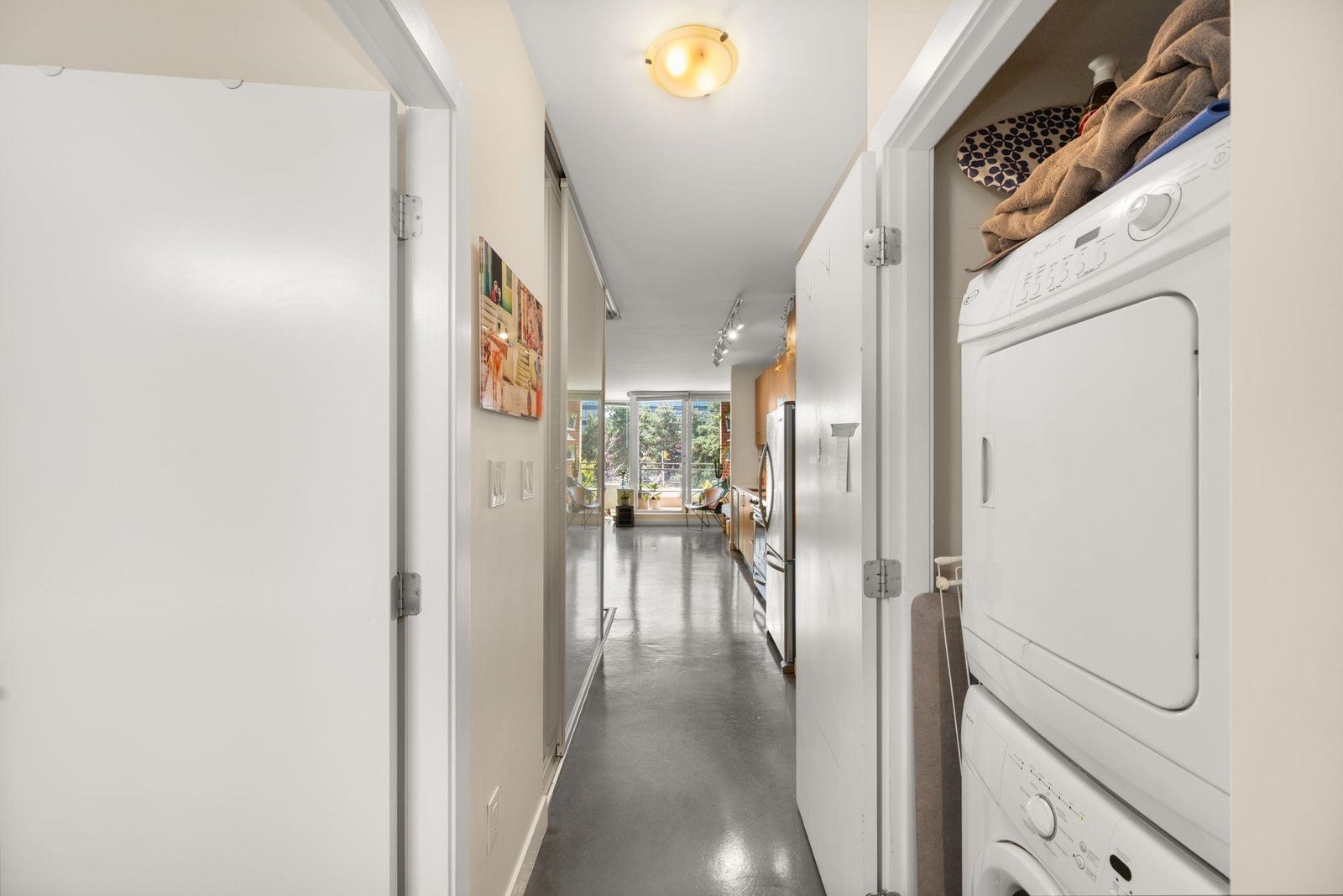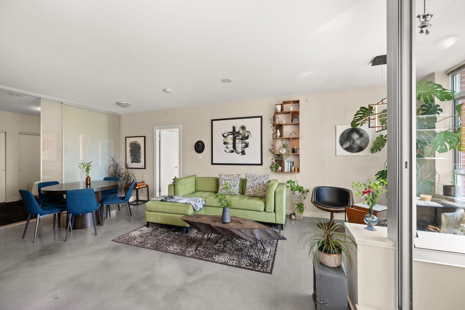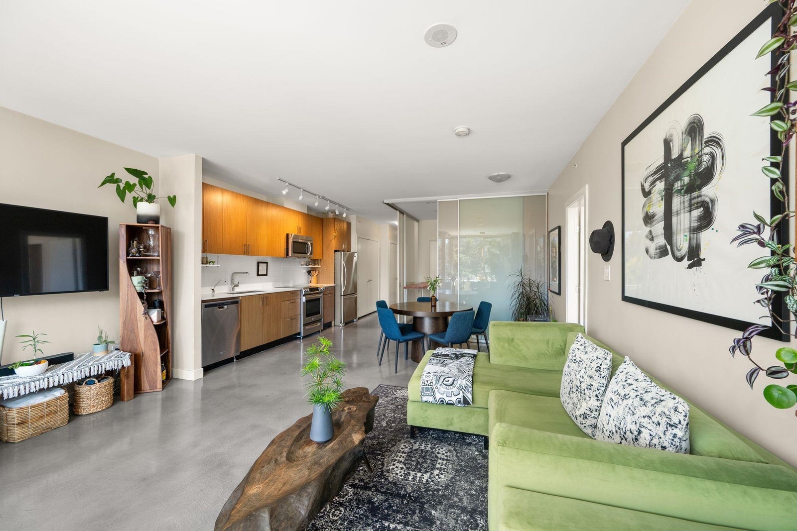 Embrace urban elegance in this stunning 2-bedroom, 2-bathroom loft in the lively Strathcona neighbourhood. Filled with natural light from its south-facing design, this home invites you to enjoy coffee at local cafés, jog along the scenic Seawall, or shop at nearby boutiques. In the evenings, explore a variety of exceptional dining and vibrant happy hours just steps away. The spacious layout boasts 9-foot ceilings, polished concrete floors, and large windows that create an airy atmosphere. A covered patio offers year-round outdoor living. Enjoy high-end stainless steel appliances, ample storage, secure parking, and a storage locker. With a fitness centre and concierge services, this property is a remarkable opportunity. Pets and rentals are welcome!