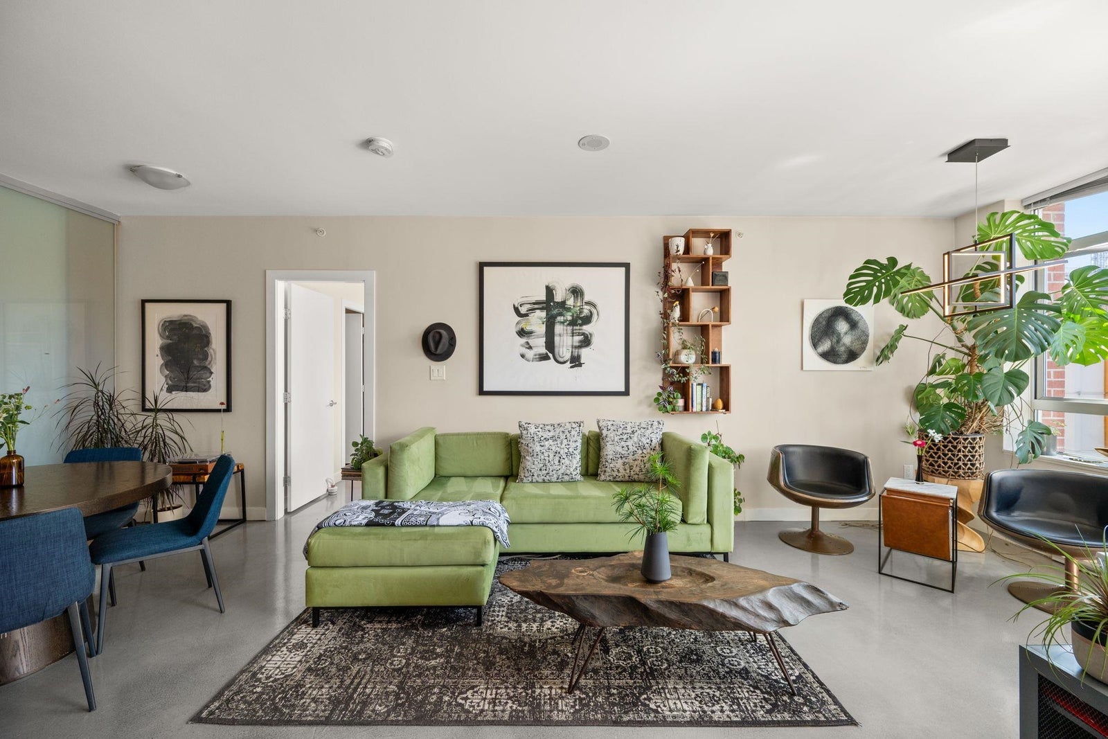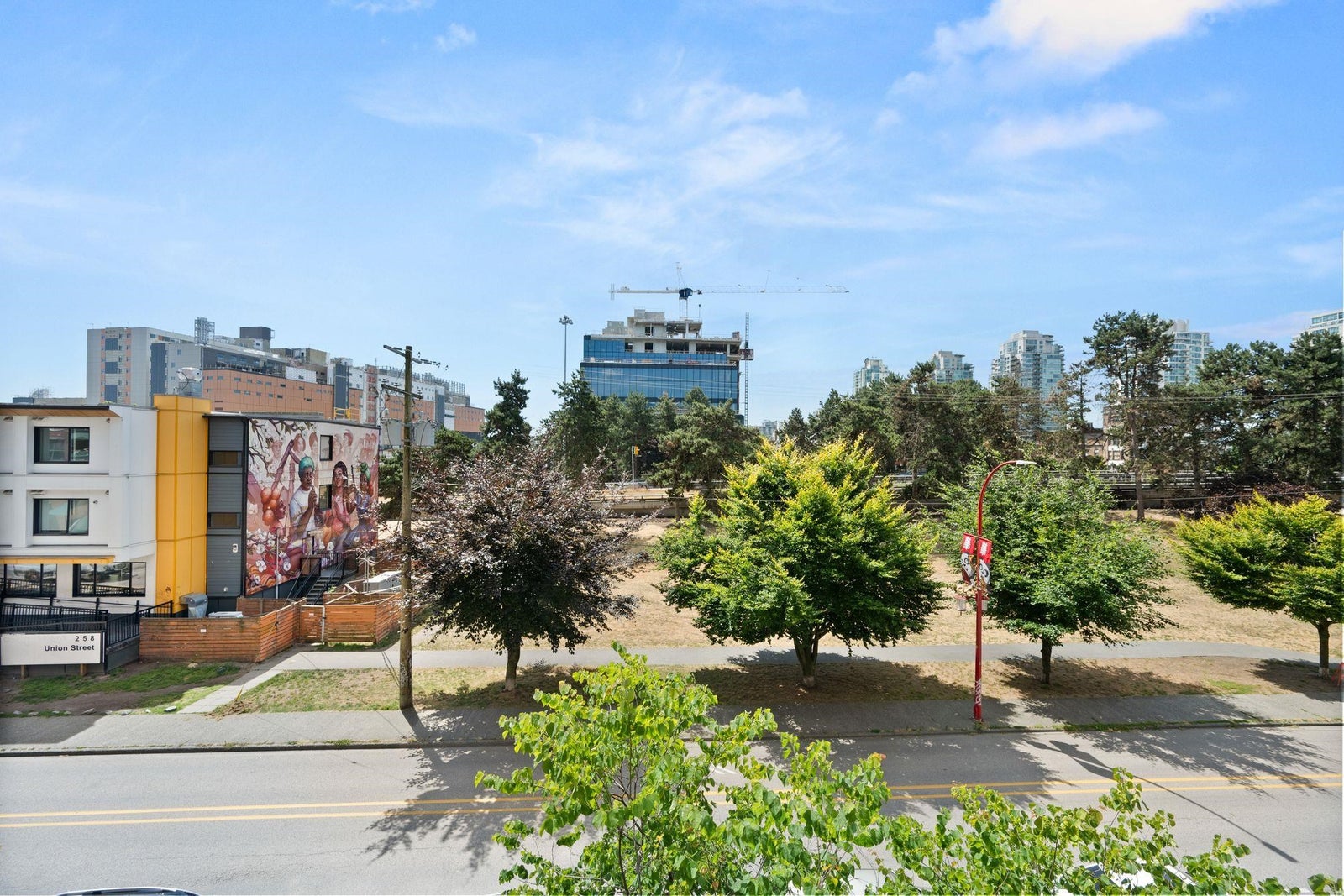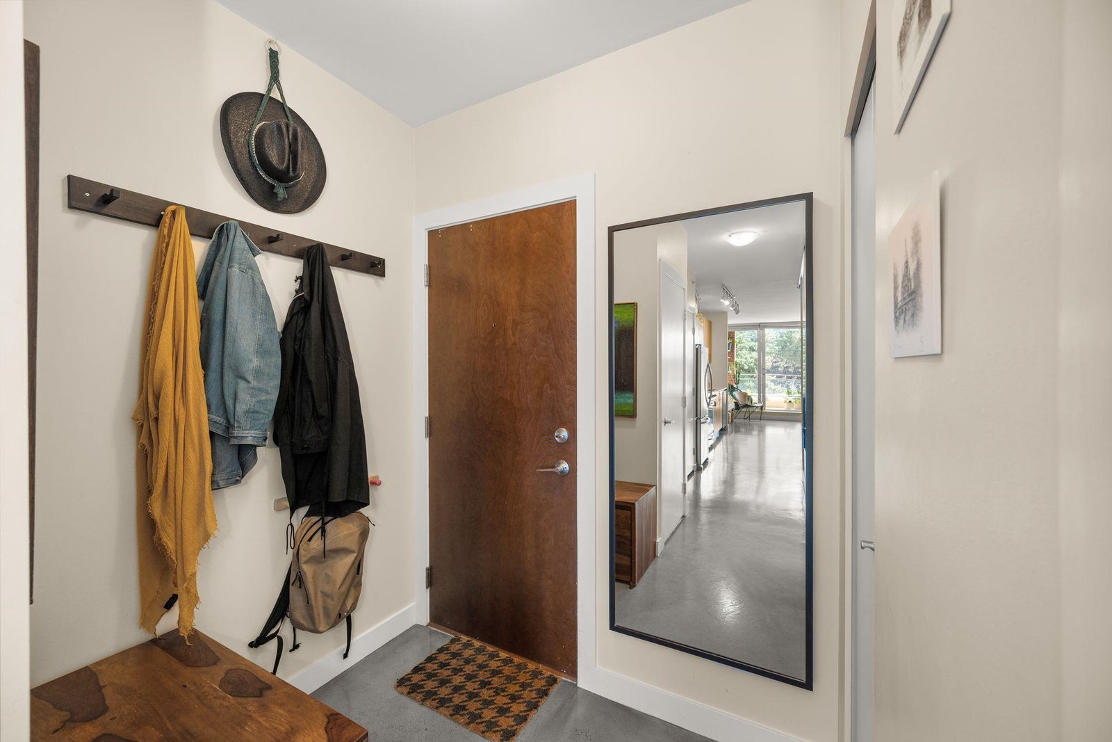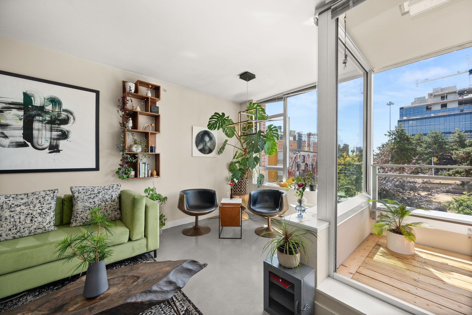 Embrace urban elegance in this stunning 2-bedroom, 2-bathroom loft in the lively Strathcona neighbourhood. Filled with natural light from its south-facing design, this home invites you to enjoy coffee at local cafés, jog along the scenic Seawall, or shop at nearby boutiques. In the evenings, explore a variety of exceptional dining and vibrant happy hours just steps away. The spacious layout boasts 9-foot ceilings, polished concrete floors, and large windows that create an airy atmosphere. A covered patio offers year-round outdoor living. Enjoy high-end stainless steel appliances, ample storage, secure parking, and a storage locker. With a fitness centre and concierge services, this property is a remarkable opportunity. Pets and rentals are welcome!